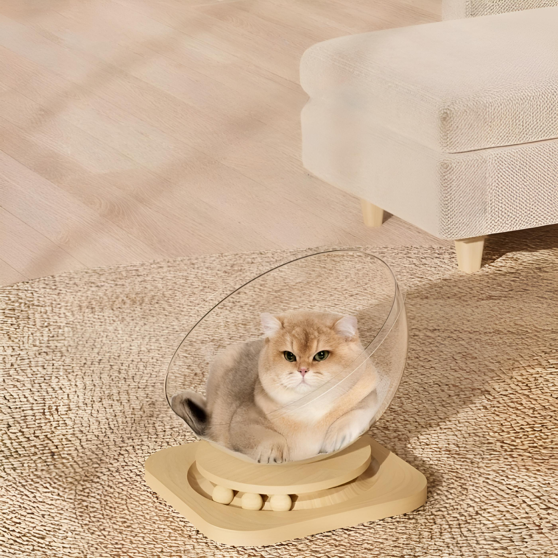За необычным дизайном скрывается очень практичная вещь. Кошки любят наблюдать за окружающим миром, оставаясь при этом в укрытии. Прозрачные стенки дают отличный обзор, а форма капсулы создает ощущение кокона, где тепло, тихо и безопасно.