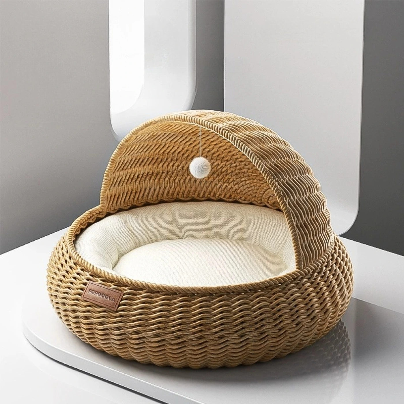 Эта лежанка выглядит как стильный элемент интерьера. Сделана из искусственного ротанга — полиэтиленовой лозы, которая не боится влаги, легко очищается и безопасна для животных. Материал экологичный, без запаха, приятный на ощупь и достаточно прочный. Уход простой: ротанг достаточно протереть влажной салфеткой.