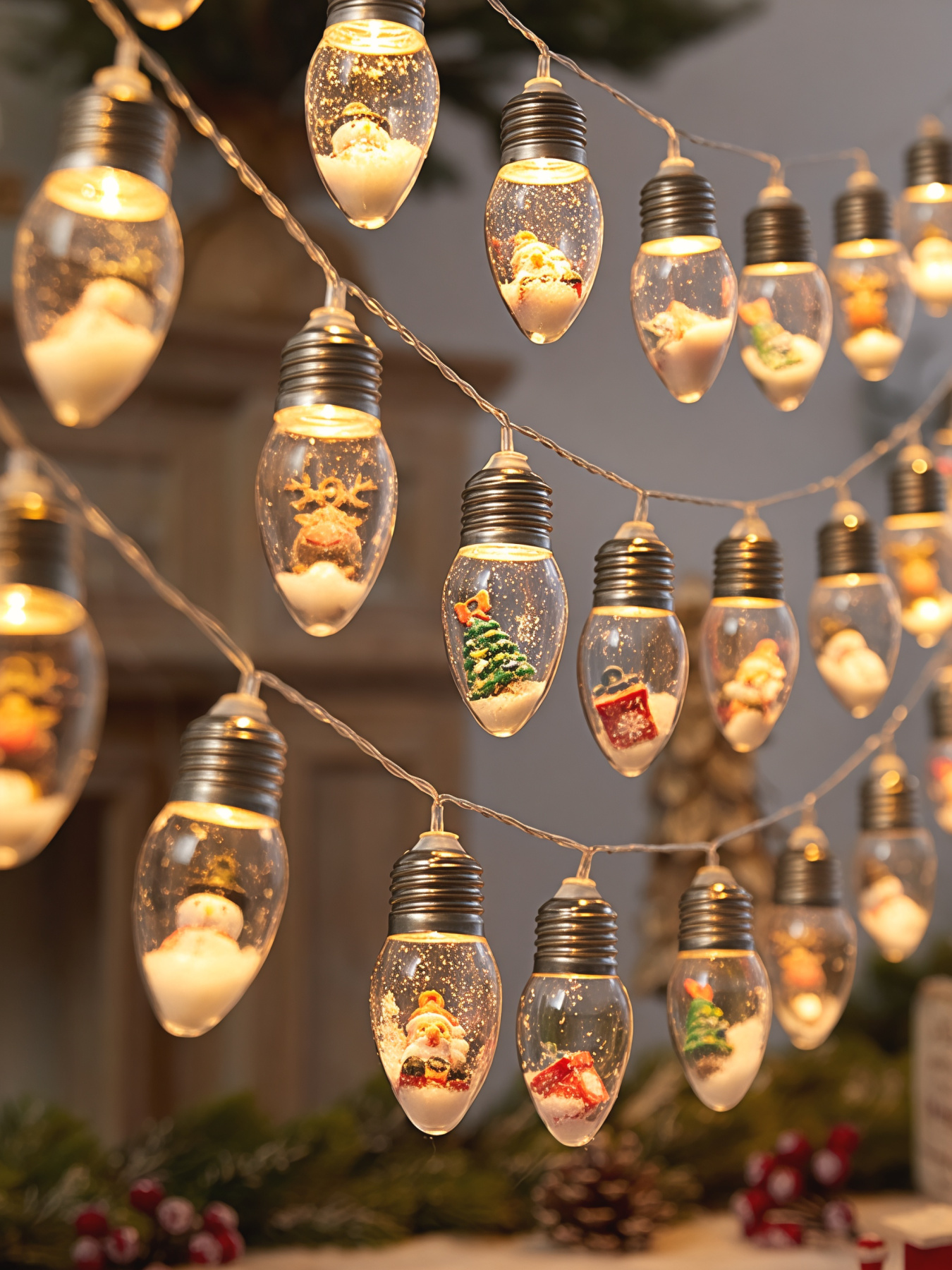 Гирлянды с миниатюрными лампочками, внутри которых прячутся ёлочки, снеговики и подарки, становятся главным героем вечера: за счёт тёплого света такие гирлянды создают эффект камерного, чуть приглушённого освещения — идеальный фон для праздничного настроения.