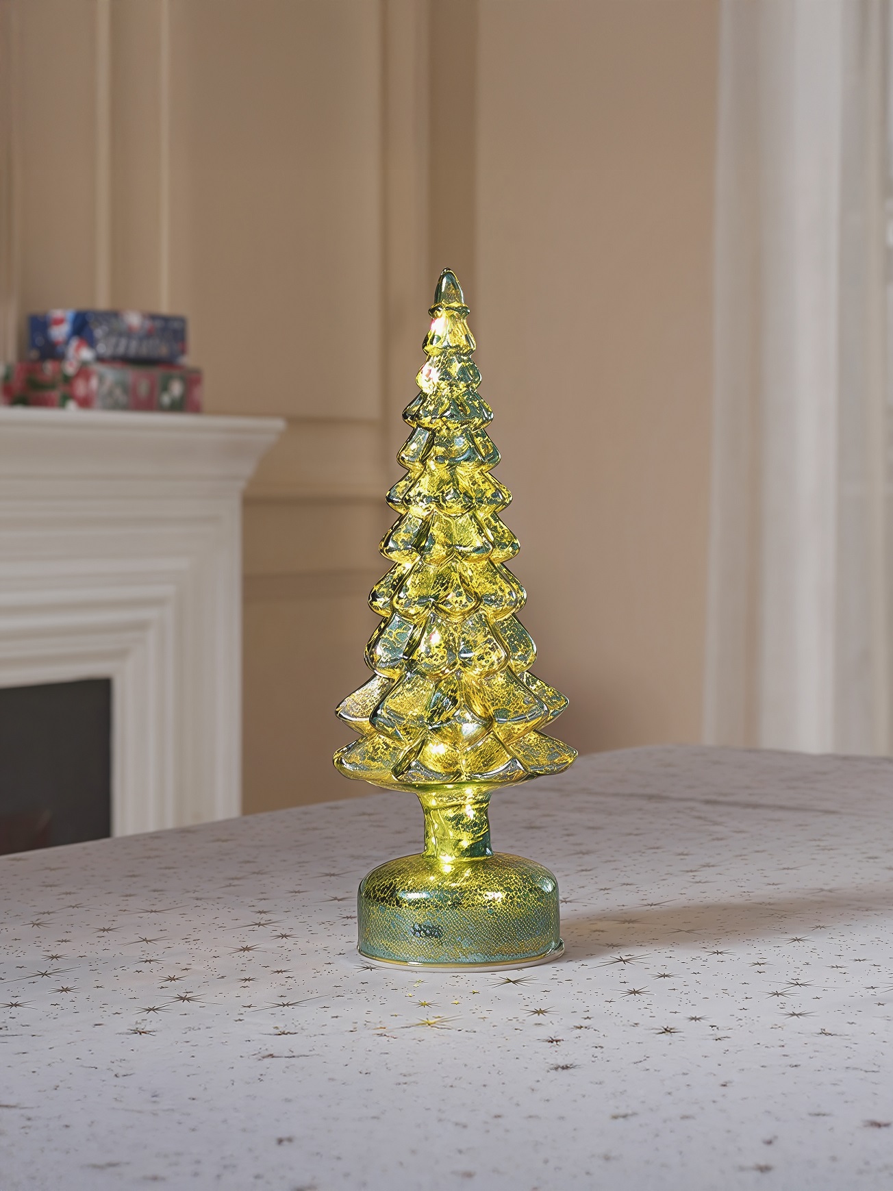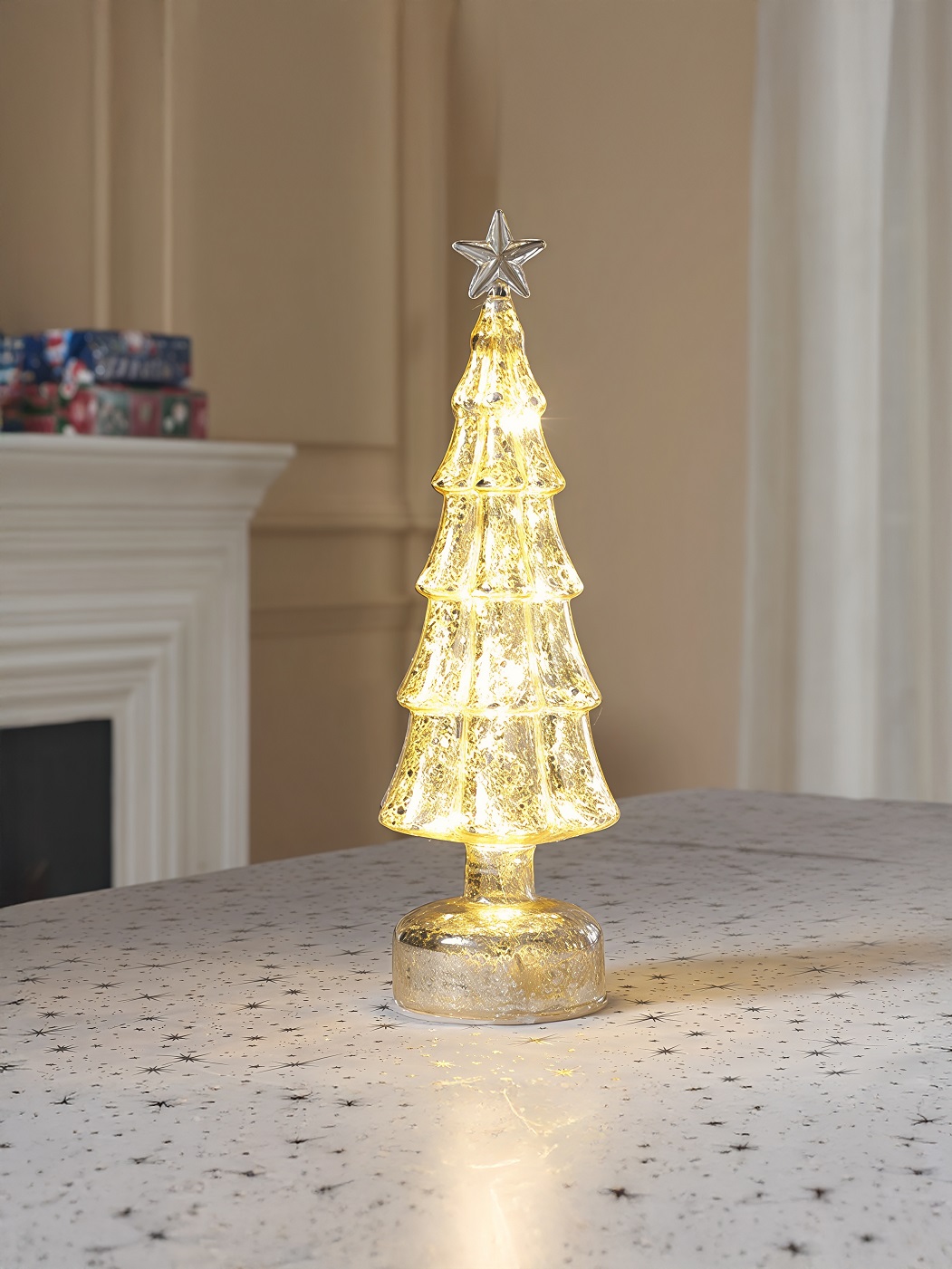 Если в квартире мало места для большой ёлки, выручат компактные стеклянные ёлочки с подсветкой. Невысокие конусные формы в золотистом или зелёном стекле выглядят как арт-объекты и отлично подходят для создания рождественского настроения.