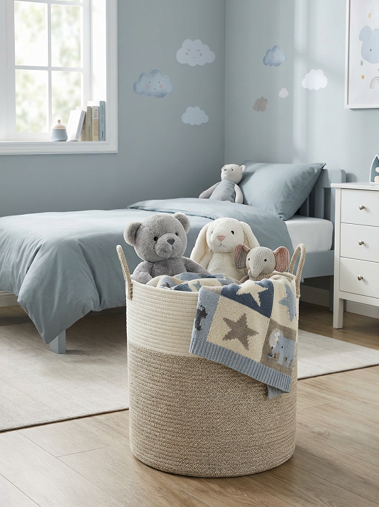 Большая плетёная корзина из хлопкового каната — один из любимых героев интерьеров Pinterest. Она выглядит как элемент декора, а работает как полноценный модуль хранения.