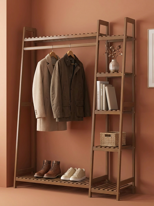 Напольная вешалка из бамбука в скандинавском стиле умеет делать то, что не по силам громоздкому шкафу:показывать одежду как капсульный гардероб, а не как склад вещей.