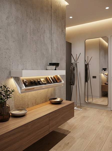 Настенная полка с выдвижным ящиком — идеальный способ «стереть» это визуально: все важные вещи лежат в одном месте, но не создают шума.
