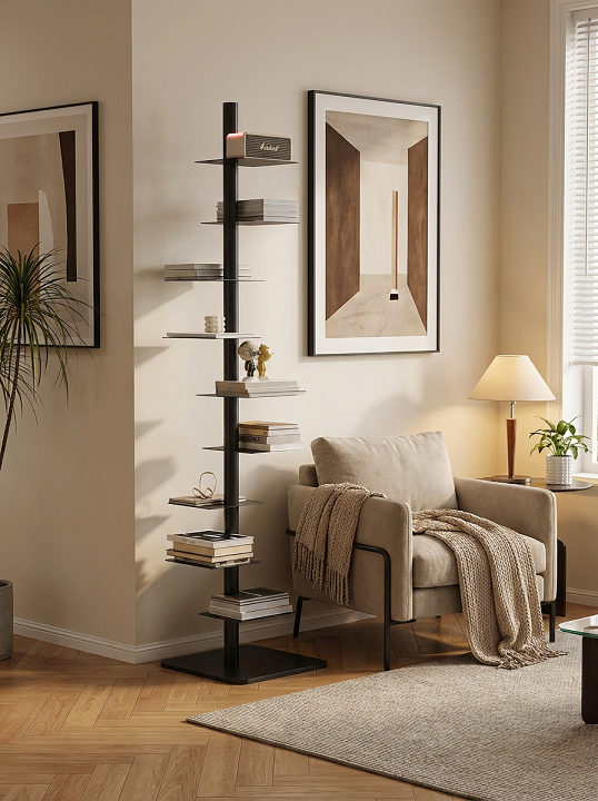 Напольный металлический стеллаж-стойка позволяет расставить книги и декоративные предметы интерьера в