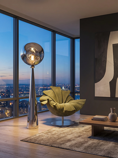 Блестящий стеклянный купол и основание в виде металлического конуса — выбор для любителей футуризма.