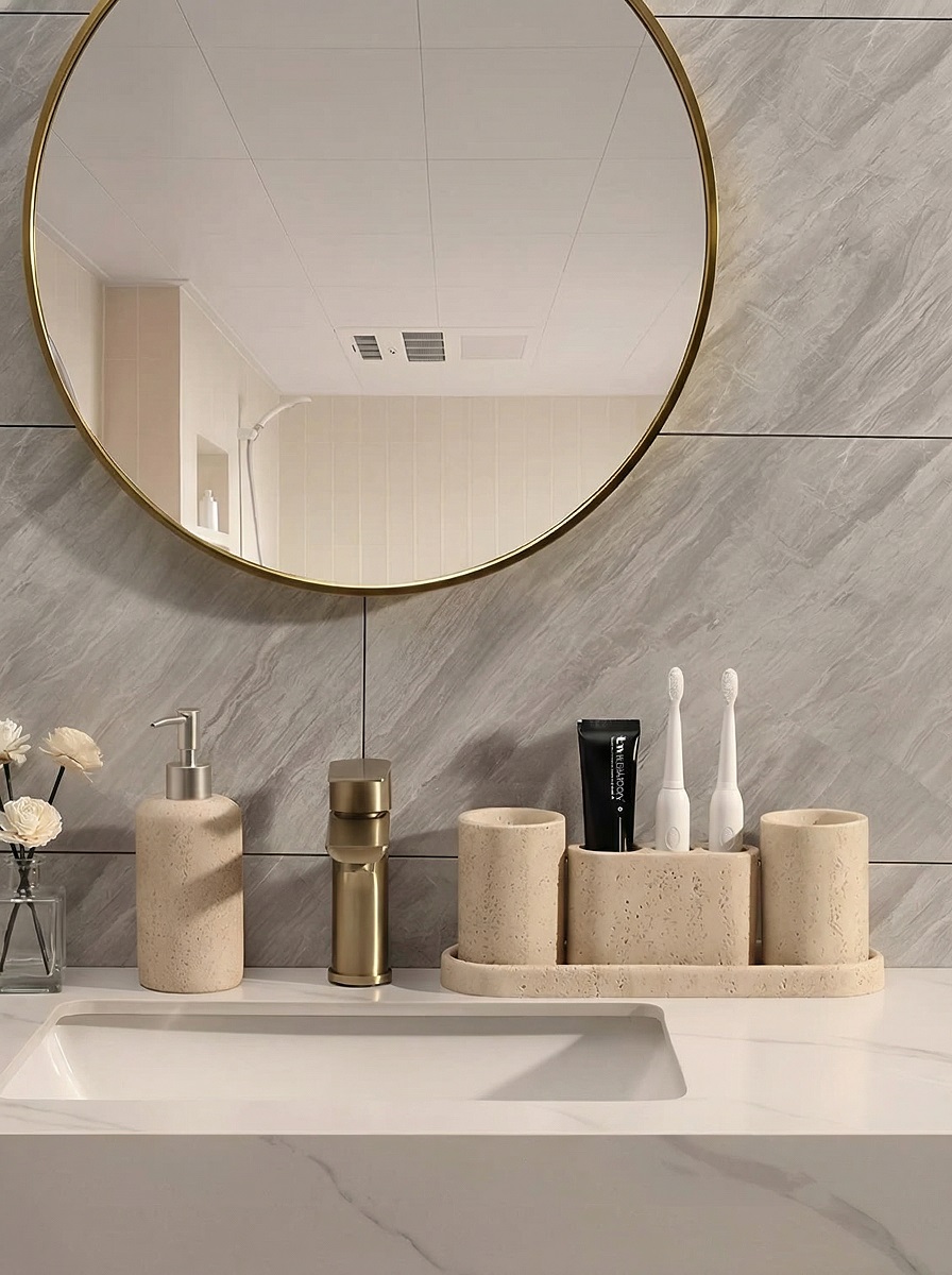спокойные оттенки керамического набора аксессуаров для ванной помогают